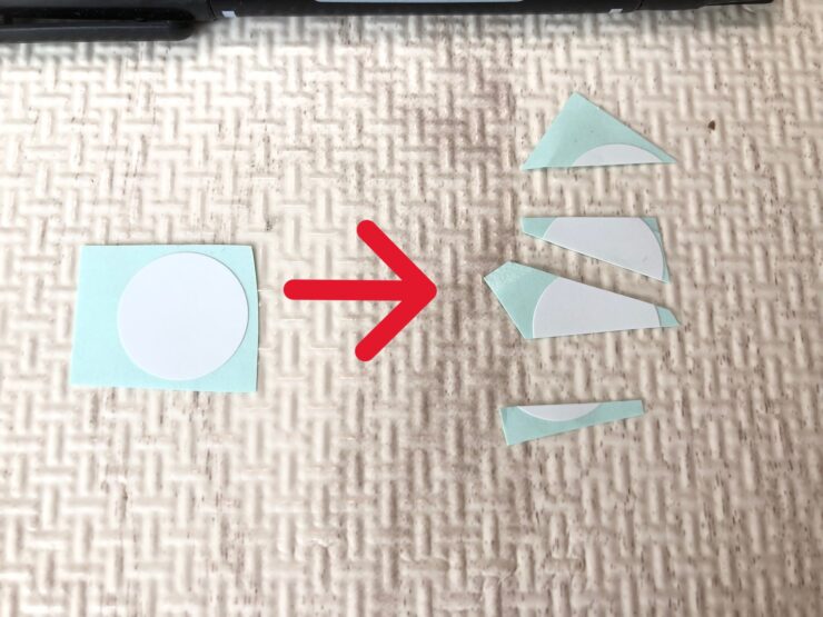 丸シールはあらかじめ写真のようにななめに、切っておくと作業がとてもスムーズです。真ん中2枚を使用します。