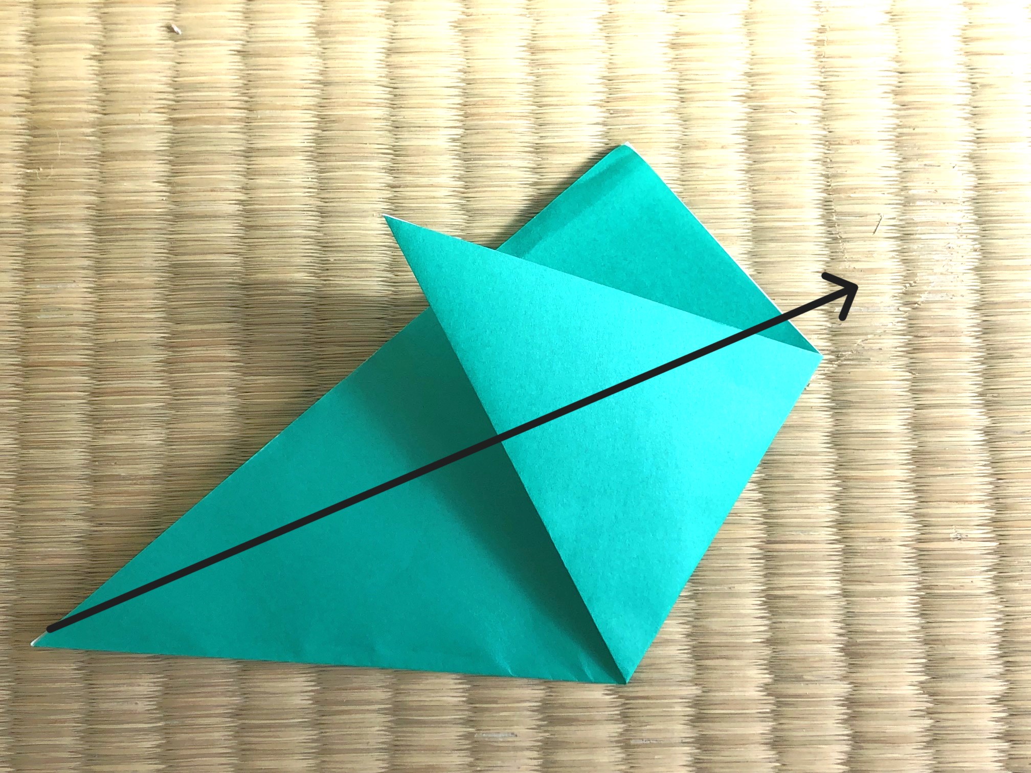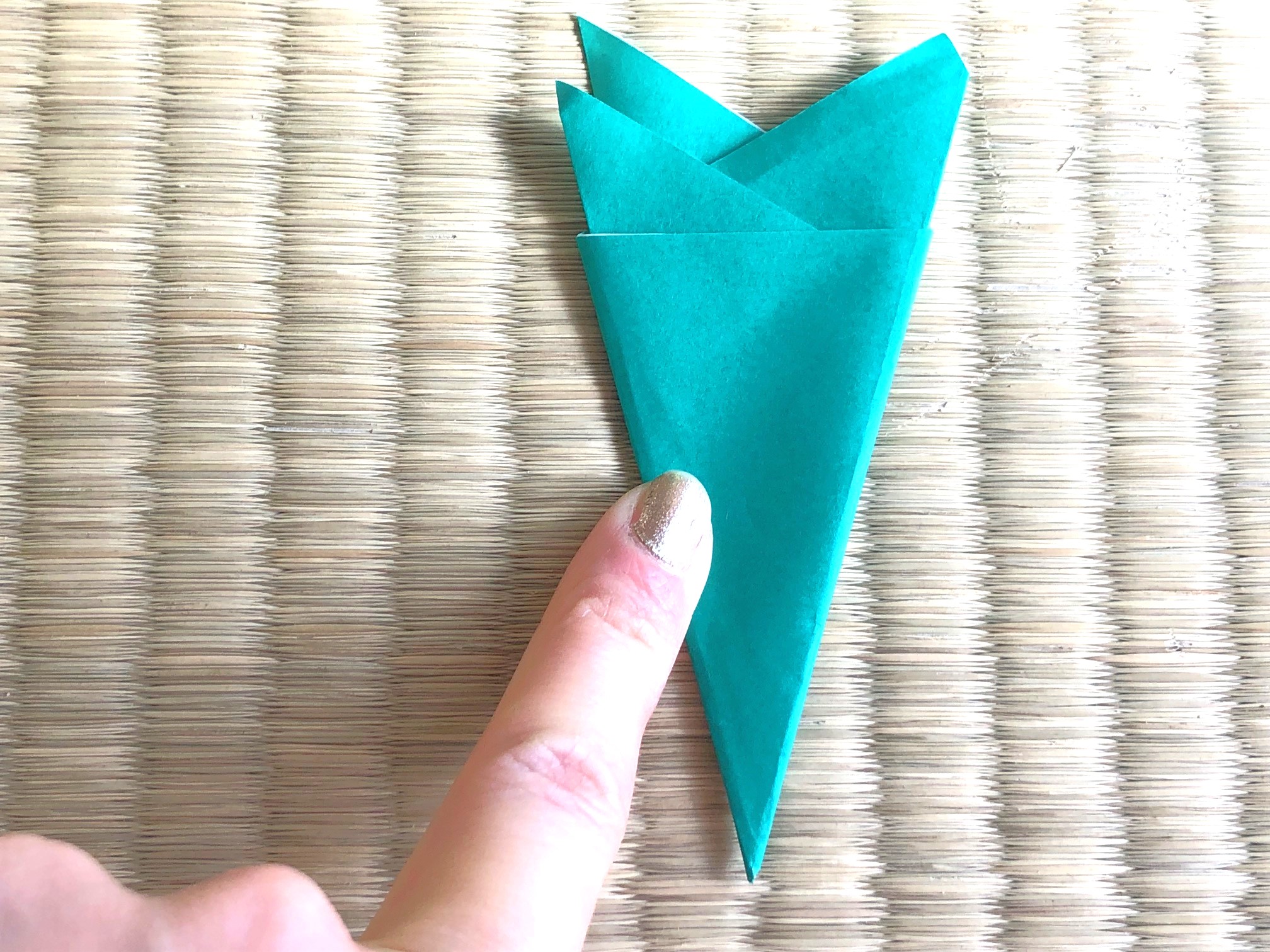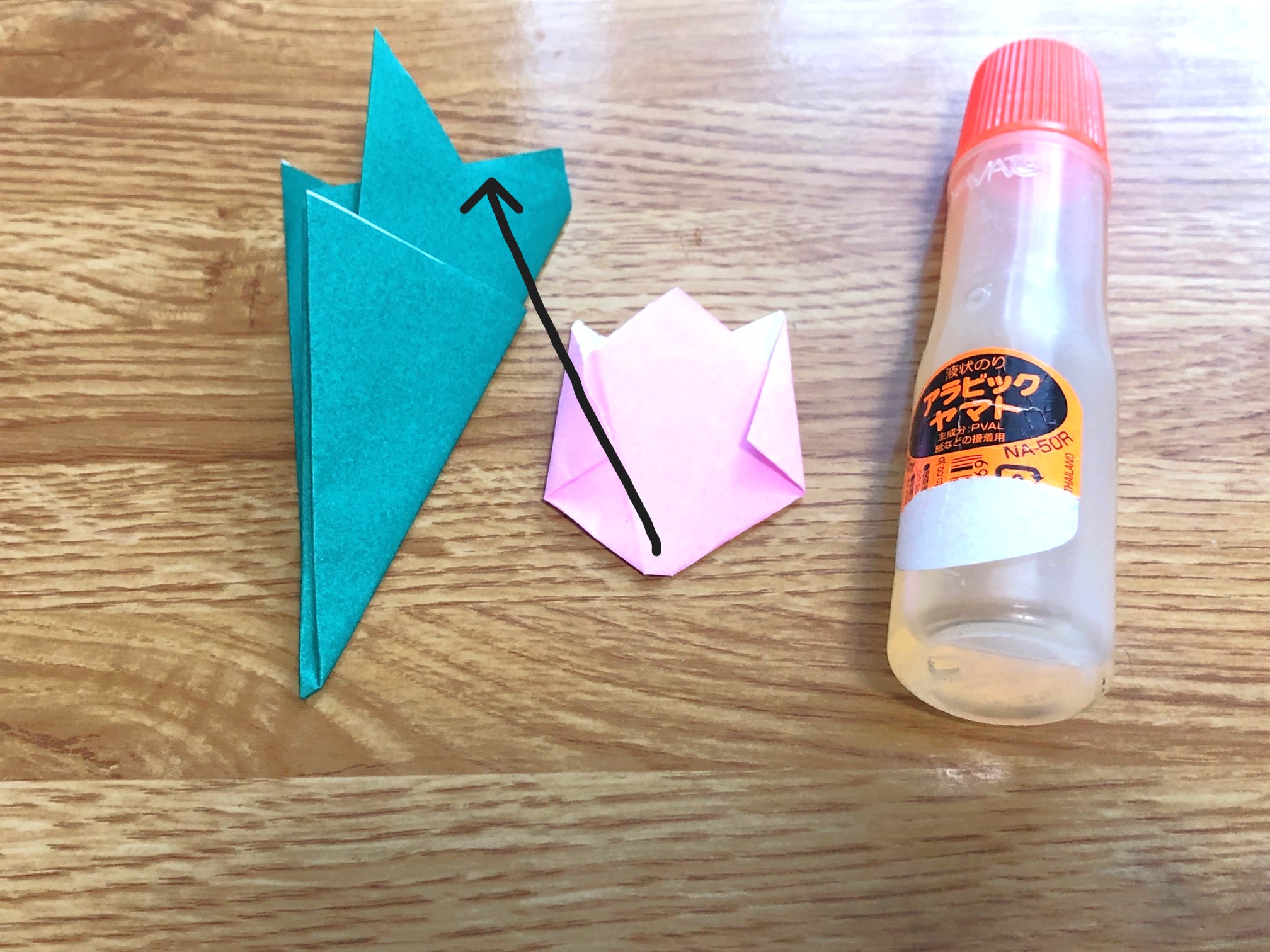 緑の折り紙の折り重なる境目と合わせて貼りましょう♪折り目も隠れて見た目もきれいに!