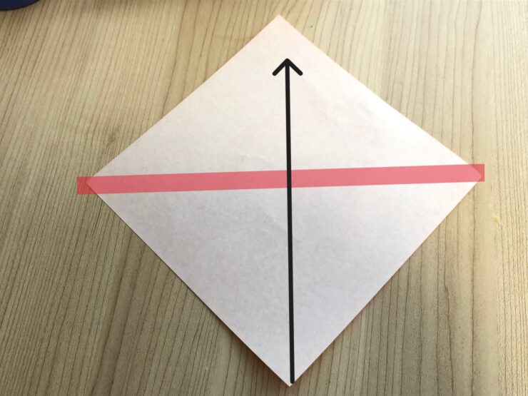 左頂点を手前に半分に折り、しっかりと折り目を付け戻します。