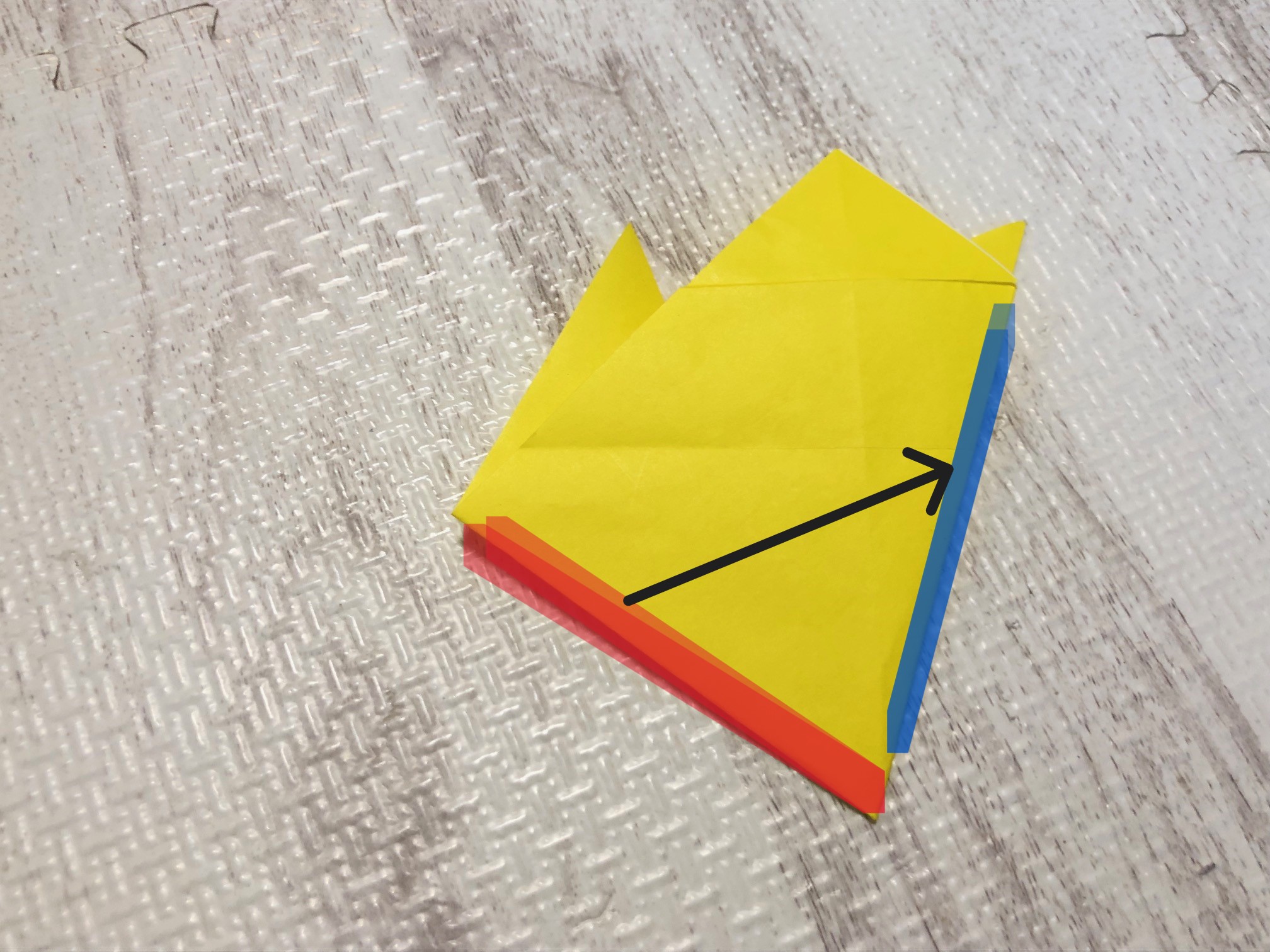 赤線と青線を参考に、下真ん中と右上の折り紙の境目をつなげるように折ります。