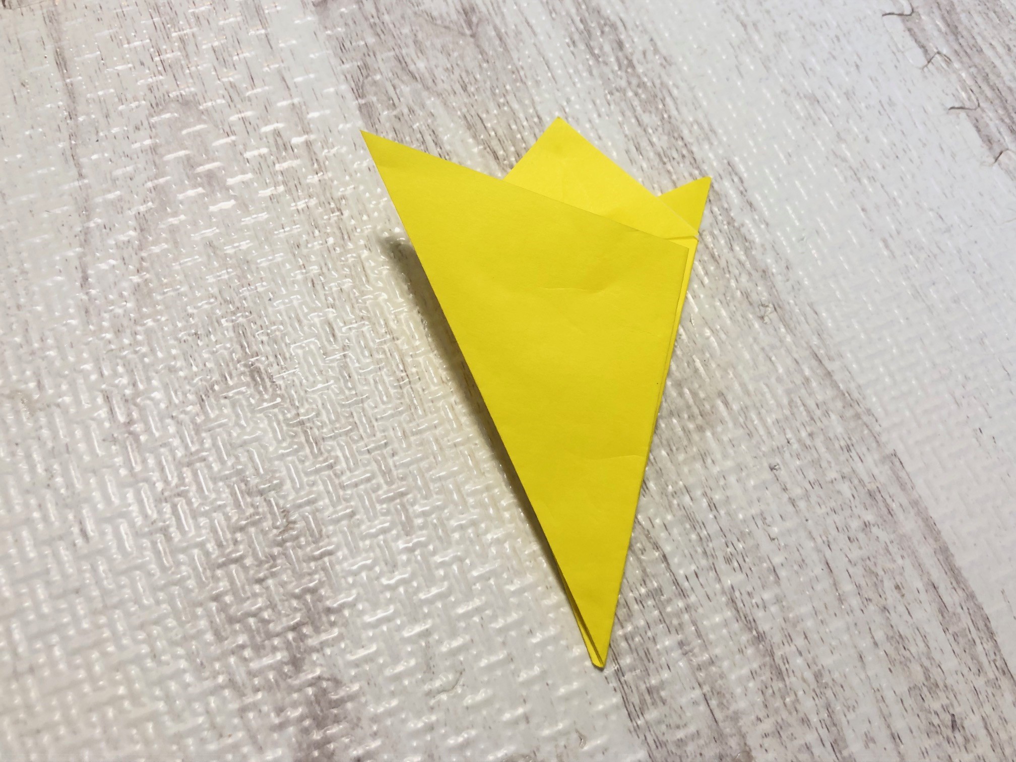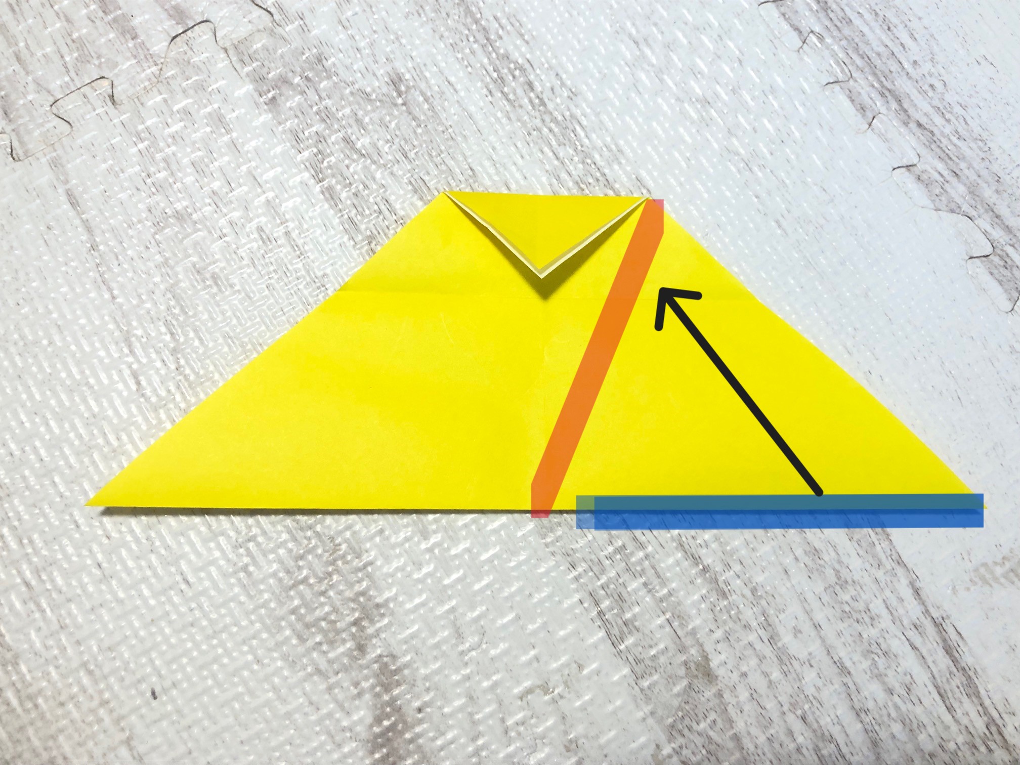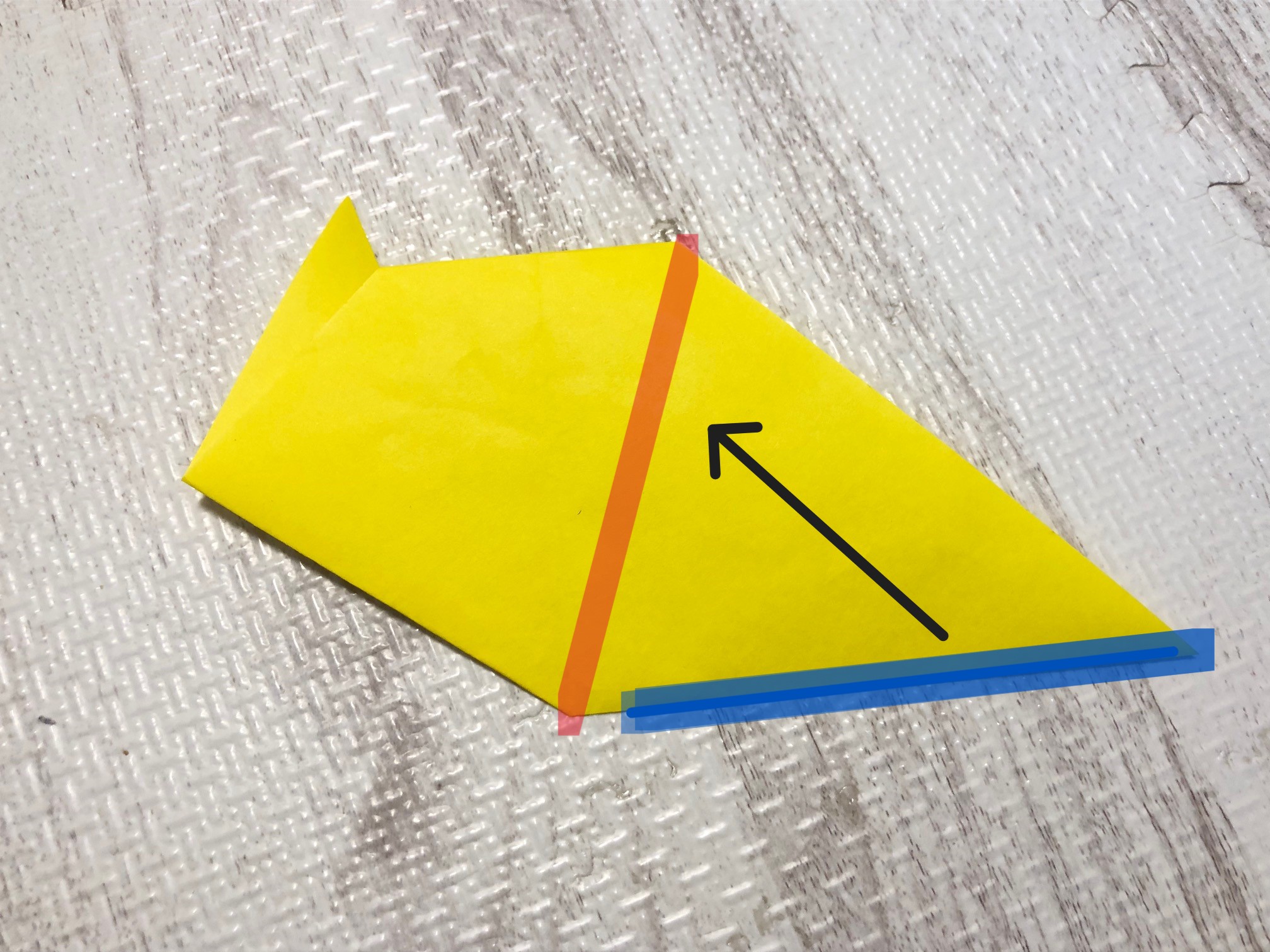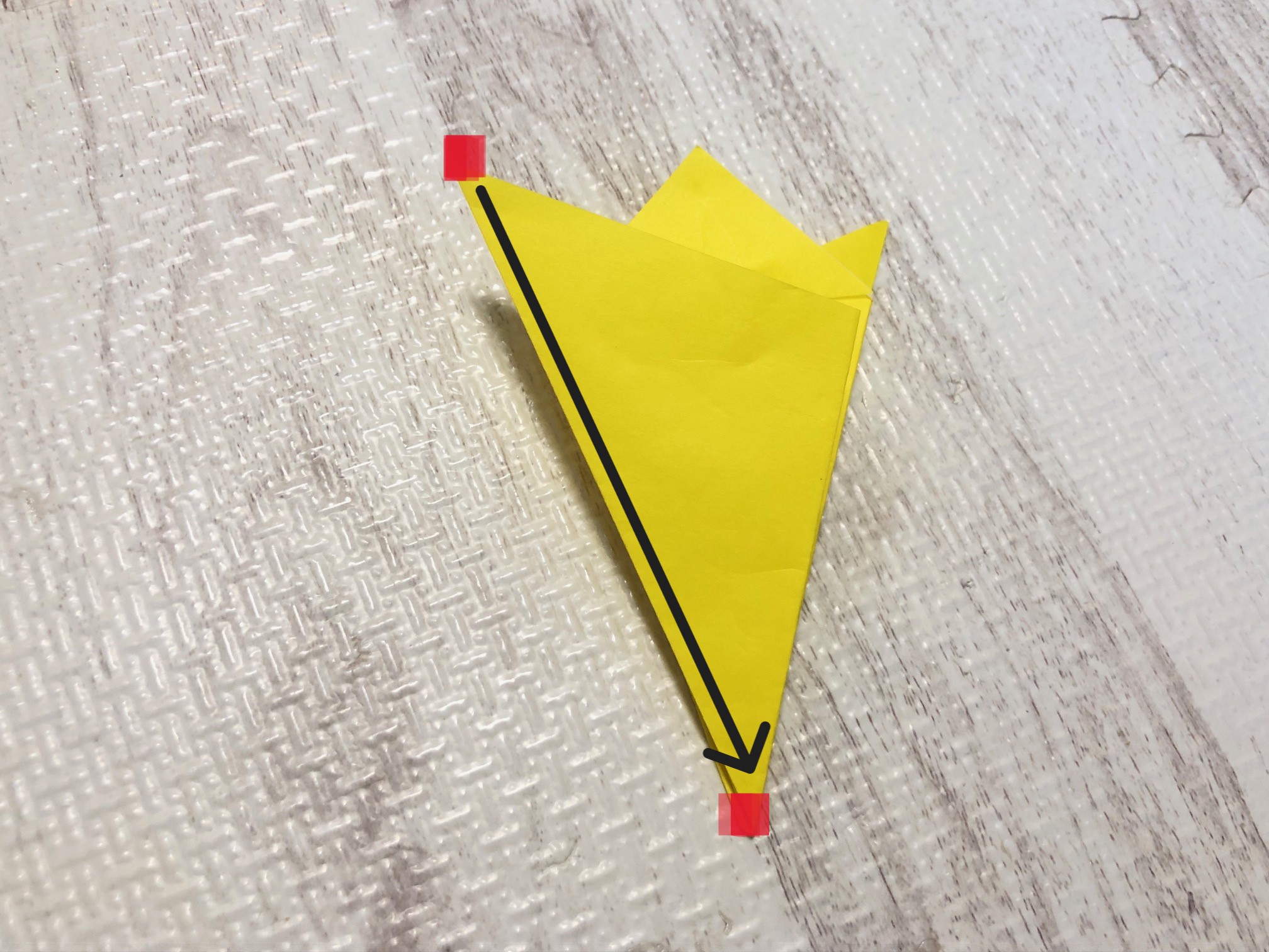 左側の底辺を、中心にある縦の折り目に沿って折ります。