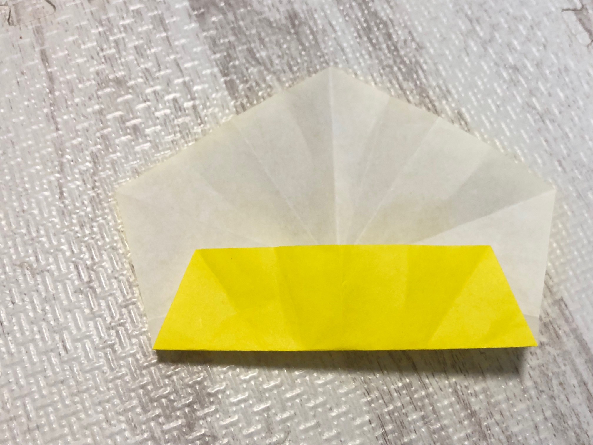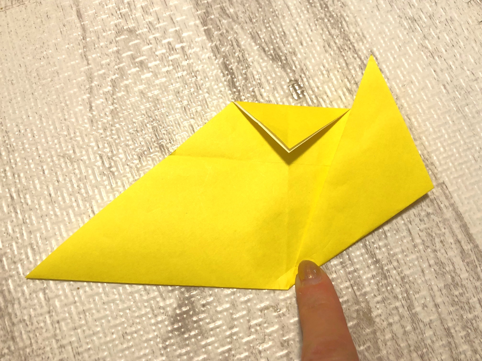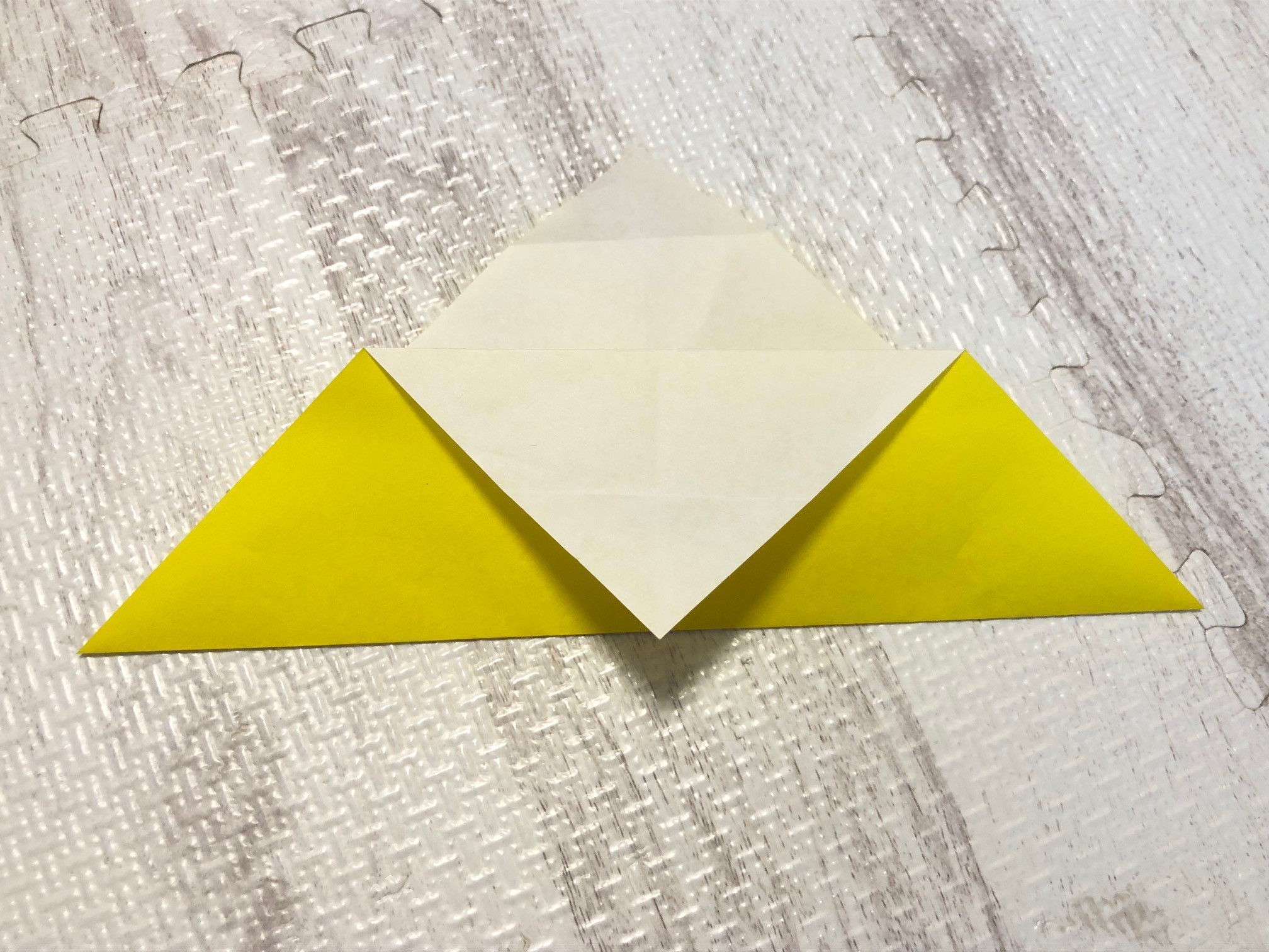 左側の底辺を、中心にある縦の折り目に沿って折ります。