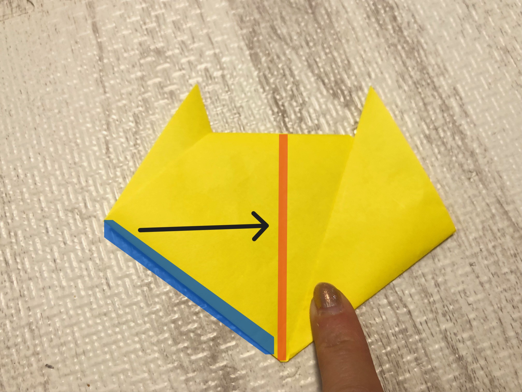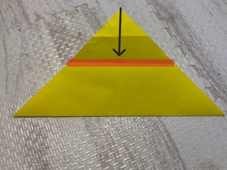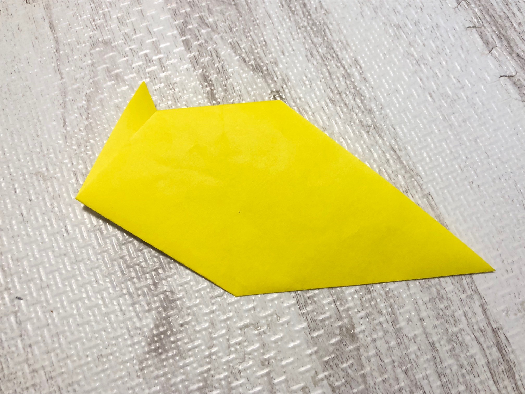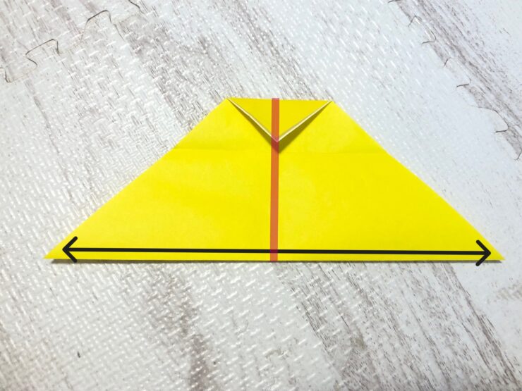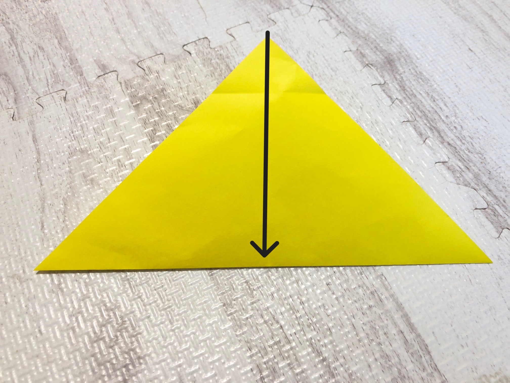 左側の底辺を、中心にある縦の折り目に沿って折ります。