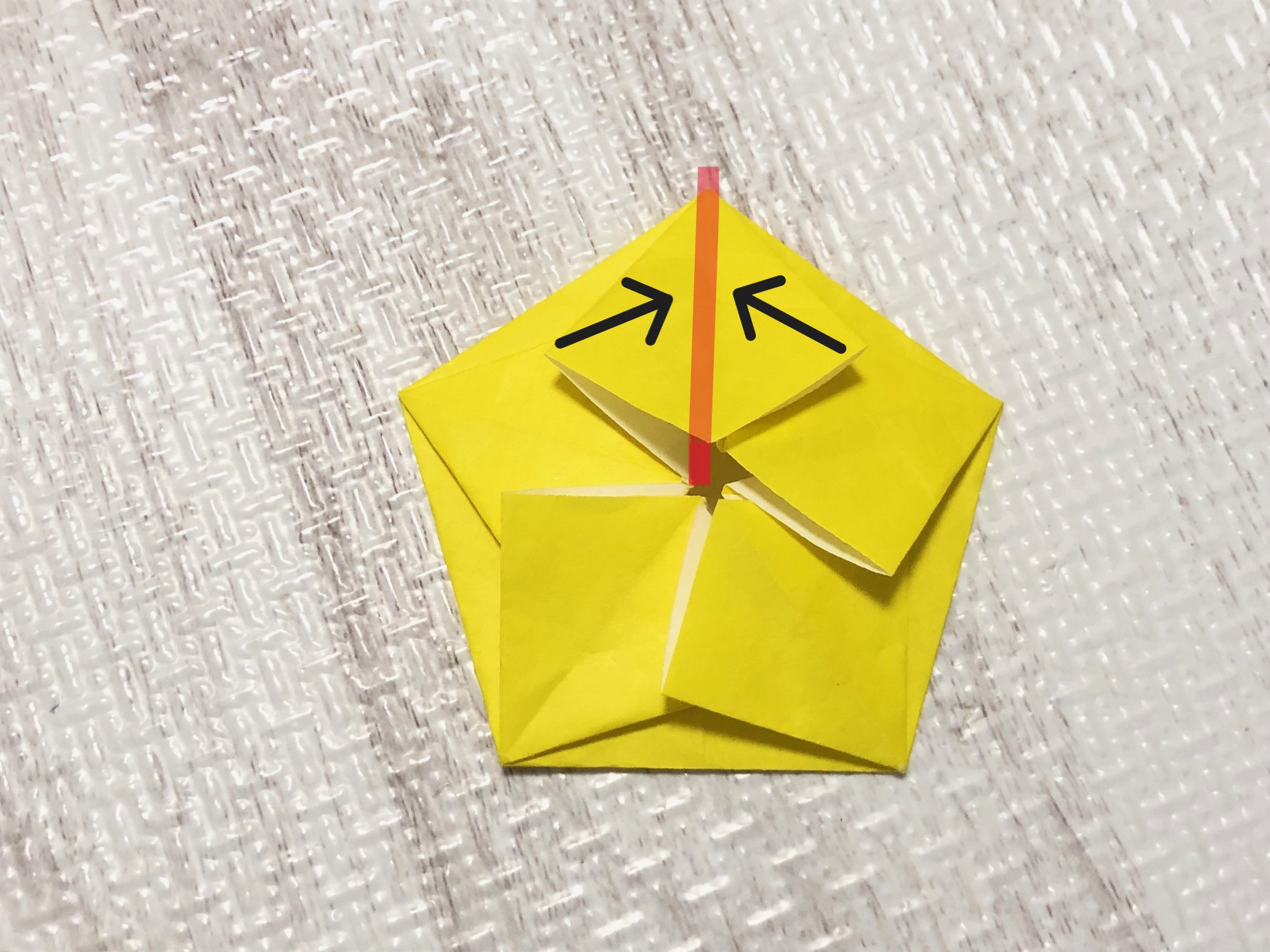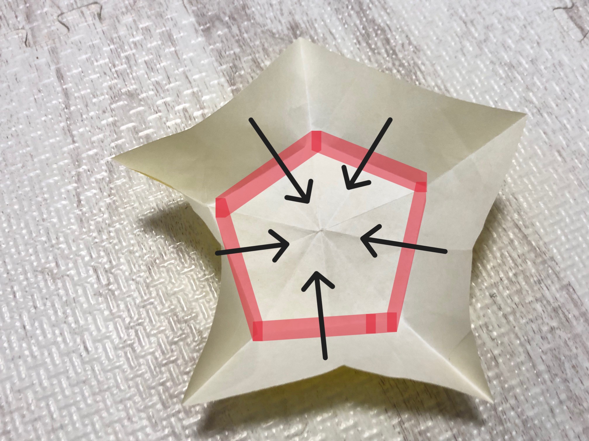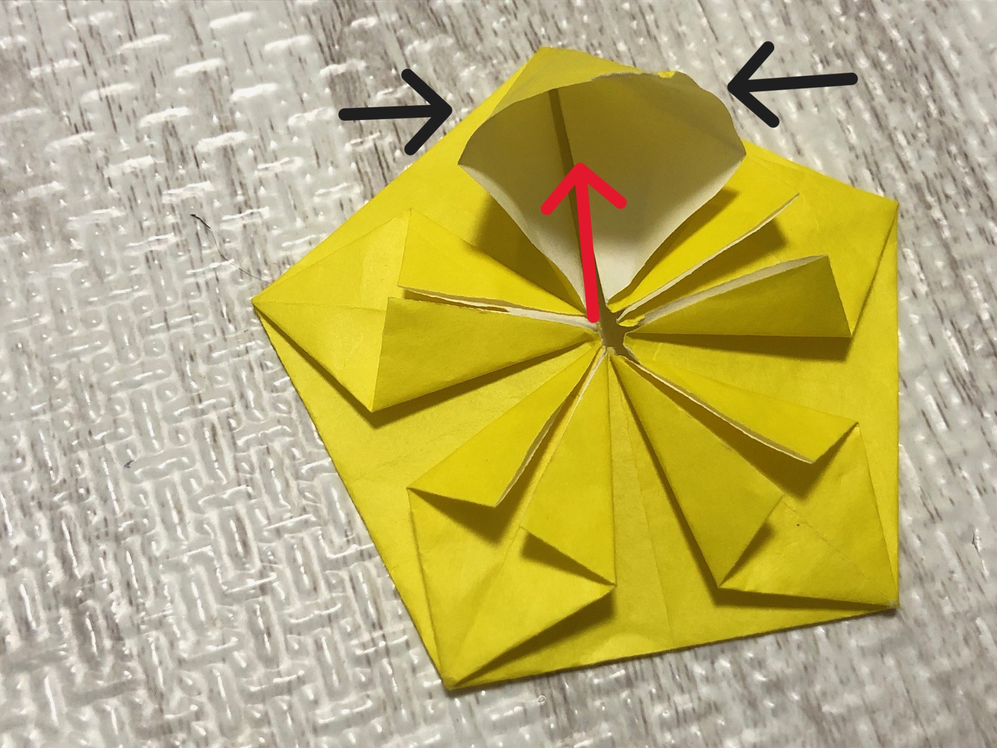 ゆっくりと折り紙を開いて、赤矢印を指で押さえながら内側へ折りたたんでいきます。