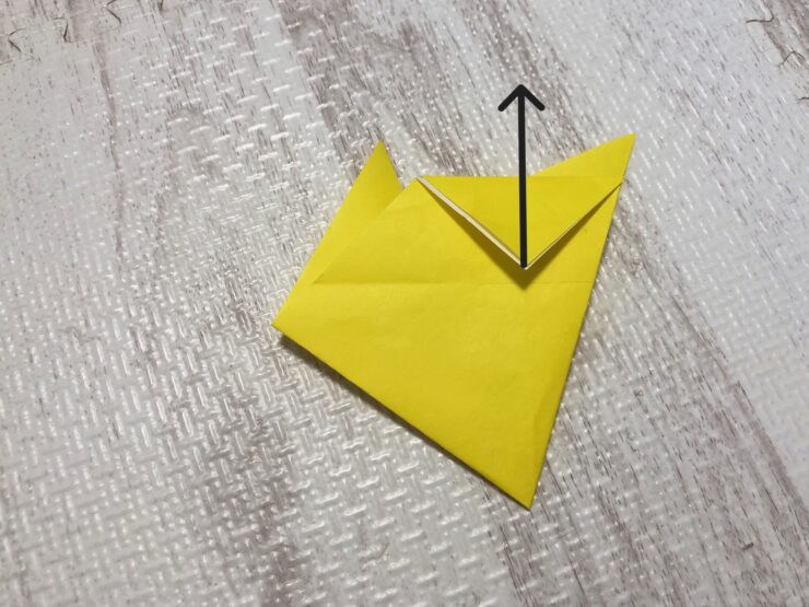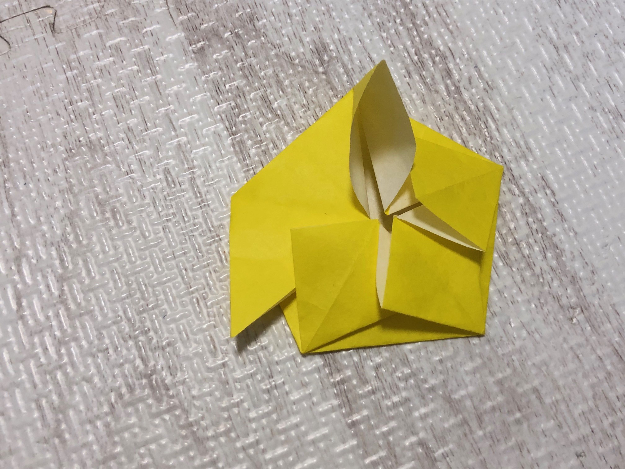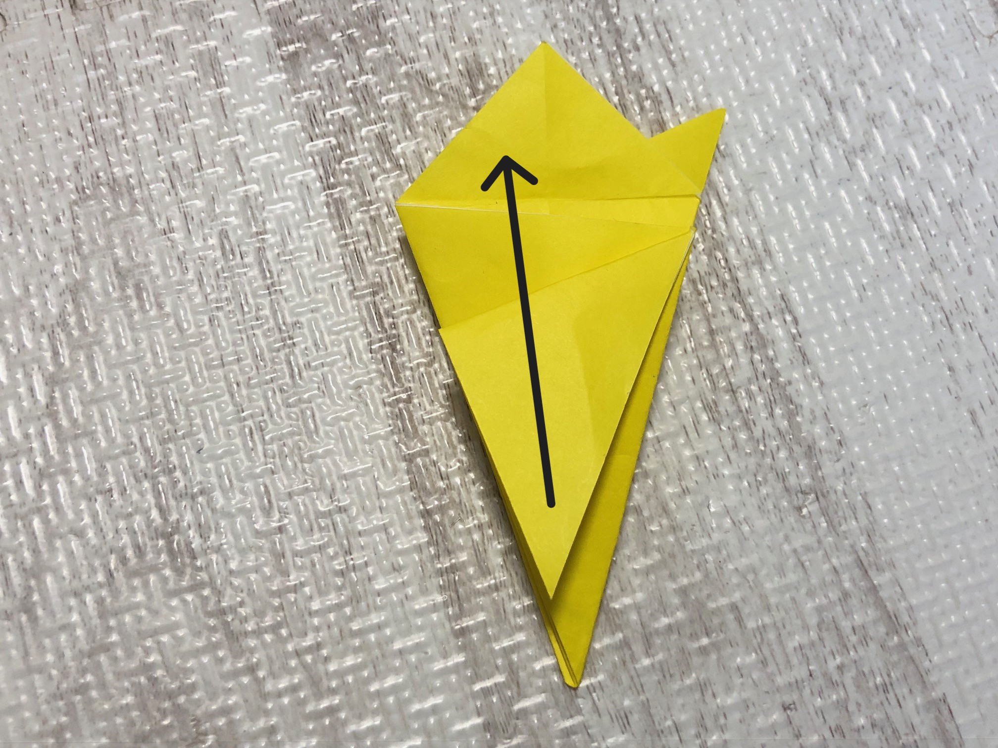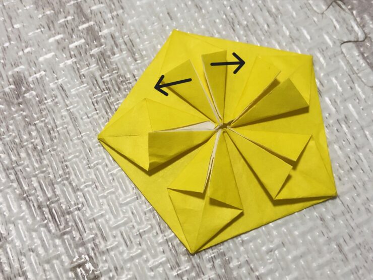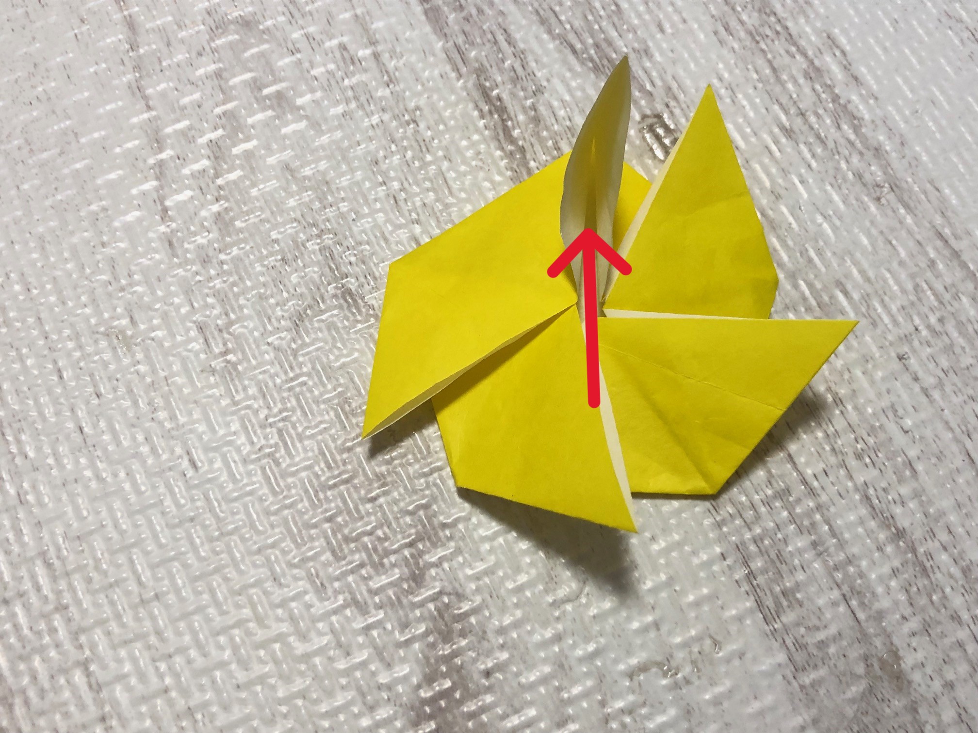 ゆっくりと折り紙を開いて、赤矢印を指で押さえながら内側へ折りたたんでいきます。