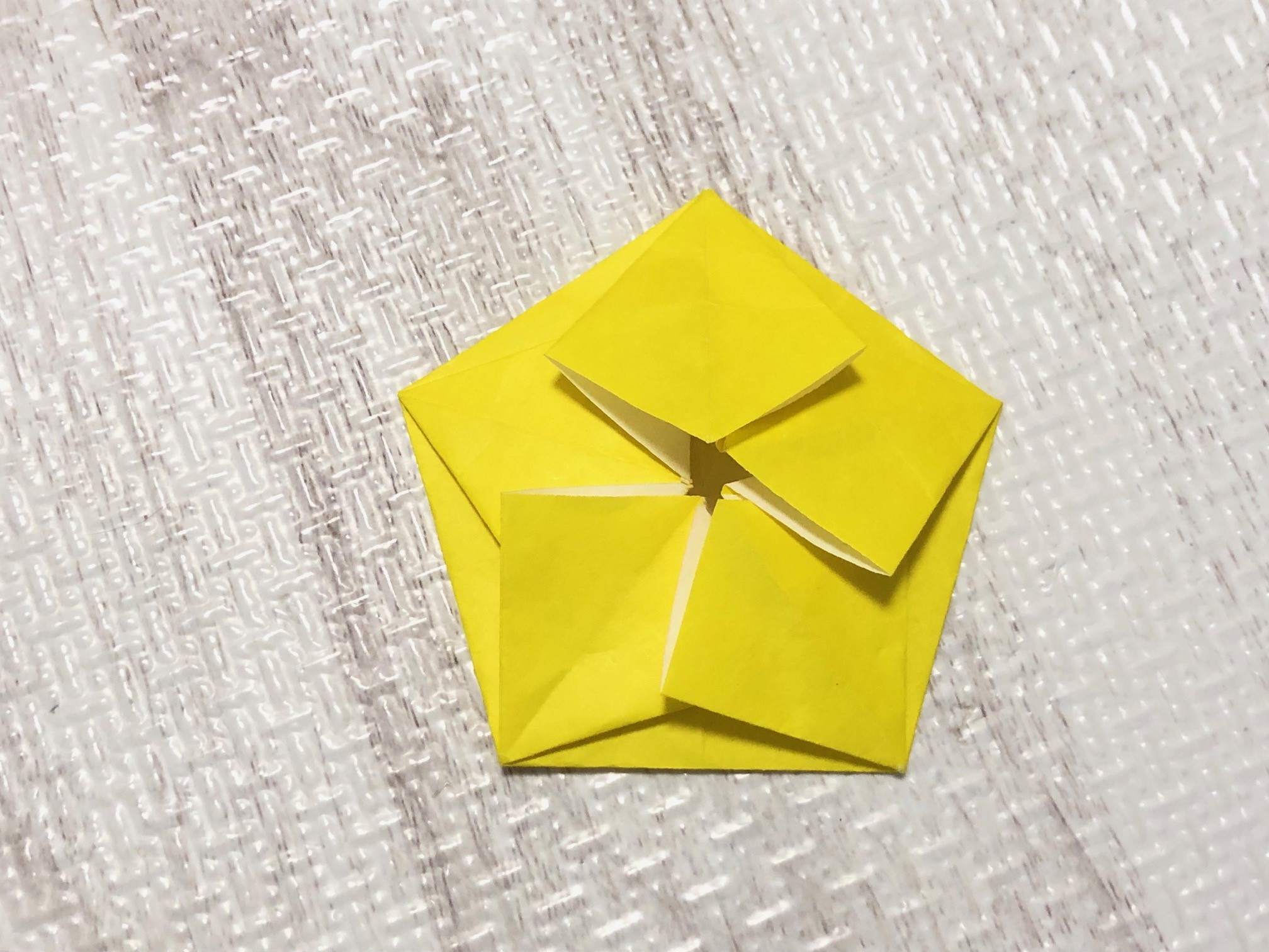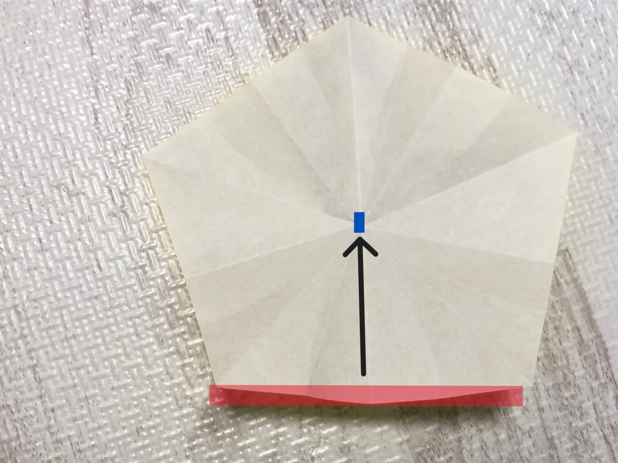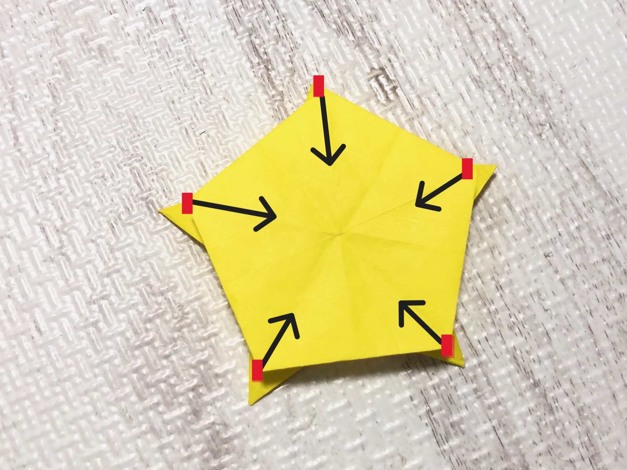 裏返して、5角形の角を中心に向かって内側へ折ります。