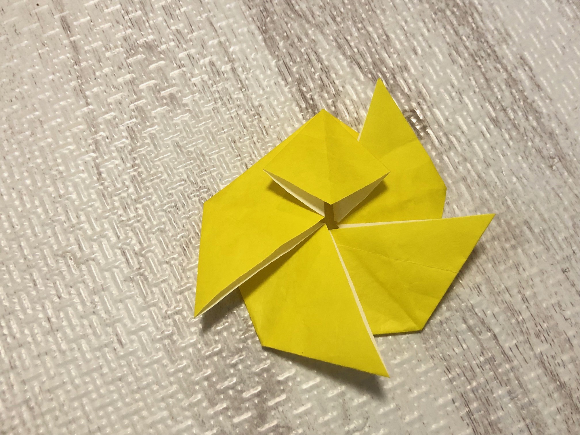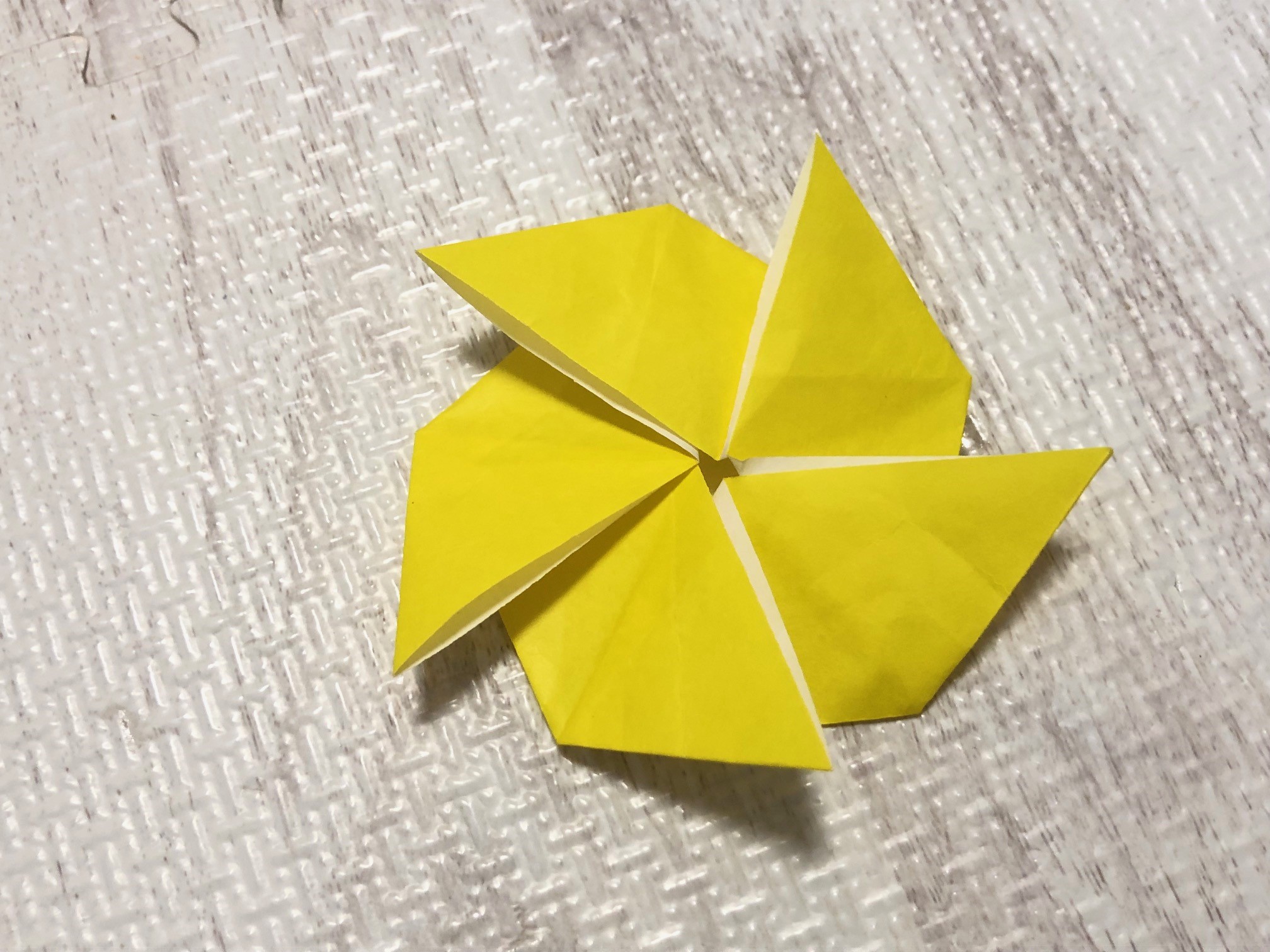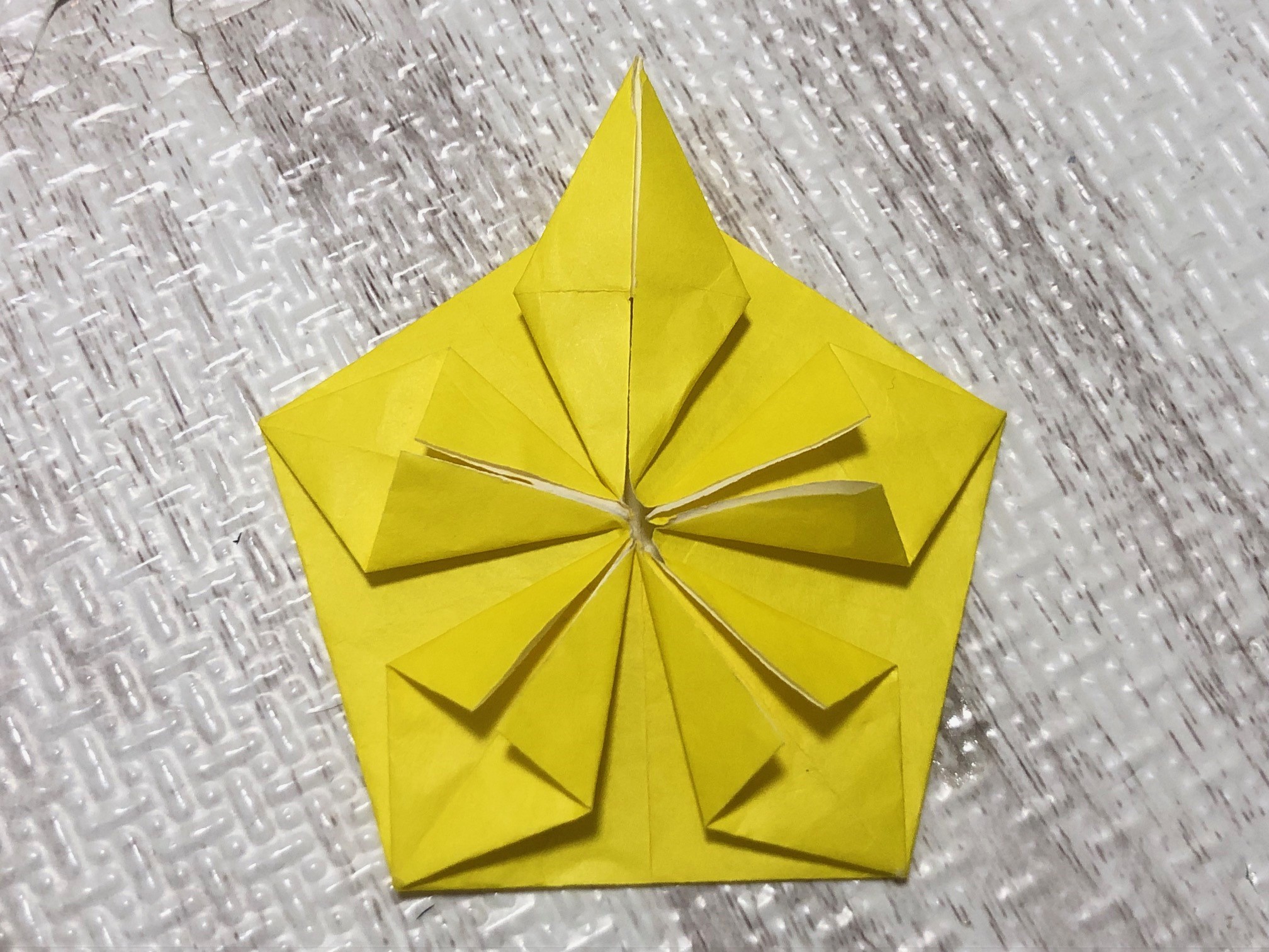 裏返して、5角形の角を中心に向かって内側へ折ります。