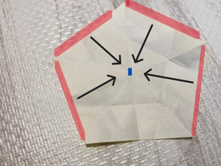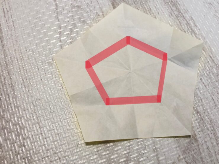 すべての辺を折り目を付け終えると、中央に小さな5角形の折り目が出来ます。