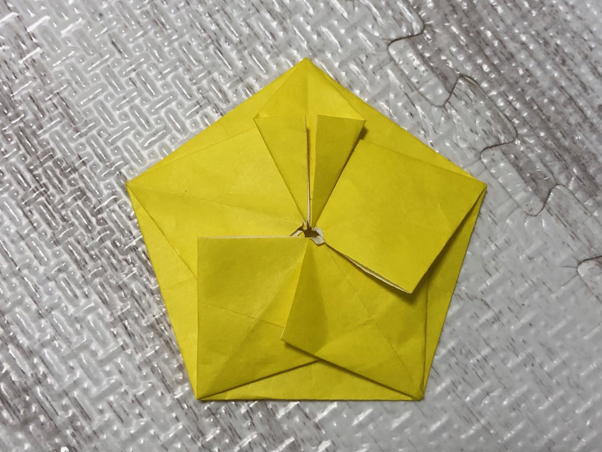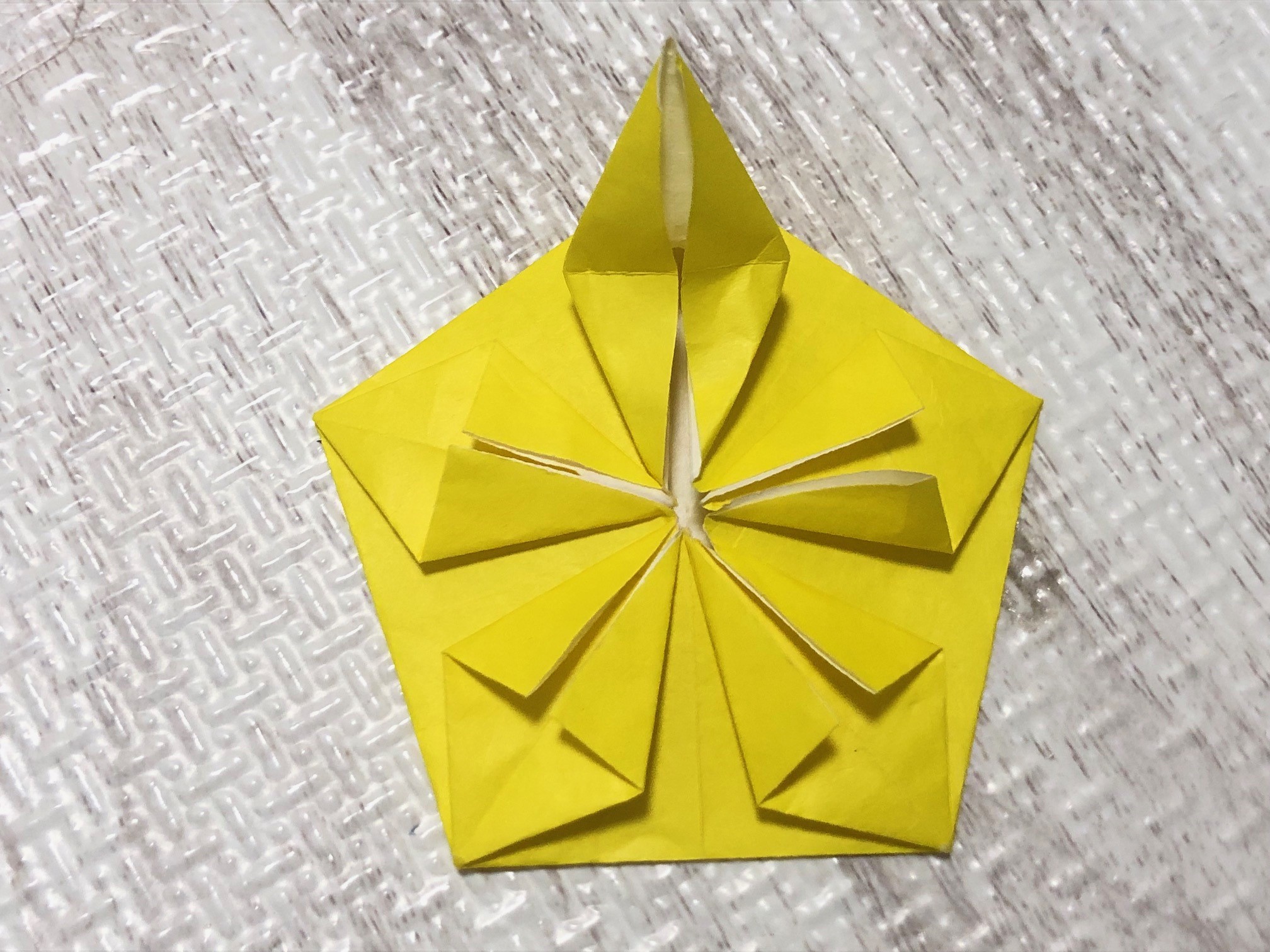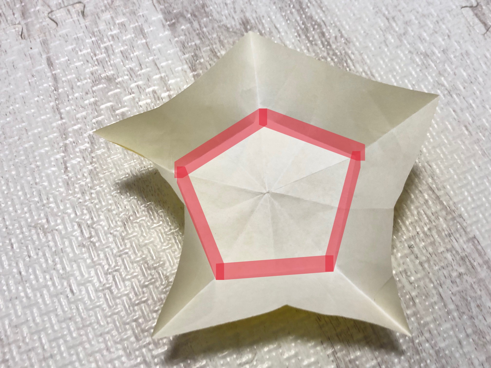 STEP16で出てきた5角形に沿って、外側から内側に折り紙を起こします。