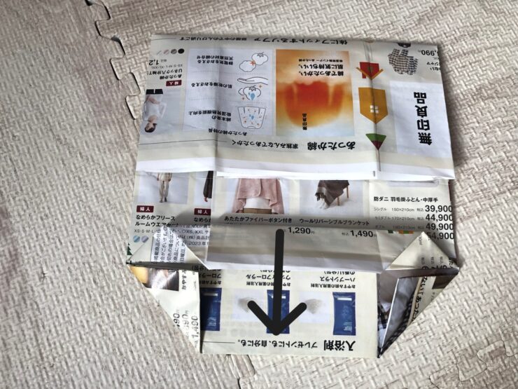 チラシによって紙の硬さも様々ですが、この折り方だったら丈夫でちょっとしたゴミ箱代わりにもなる縦長の長方形の箱が作れます。