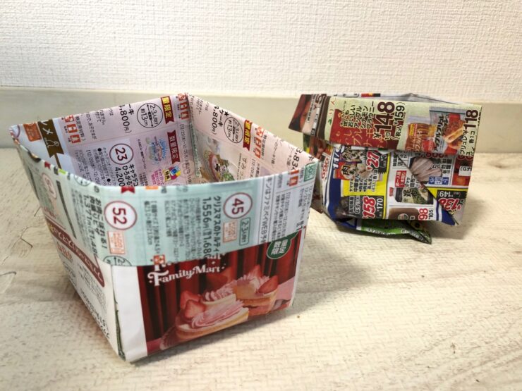 いろんなチラシの大きさを見つけて作ればゴミ箱でもテーブルの小物入れにもなりますね。