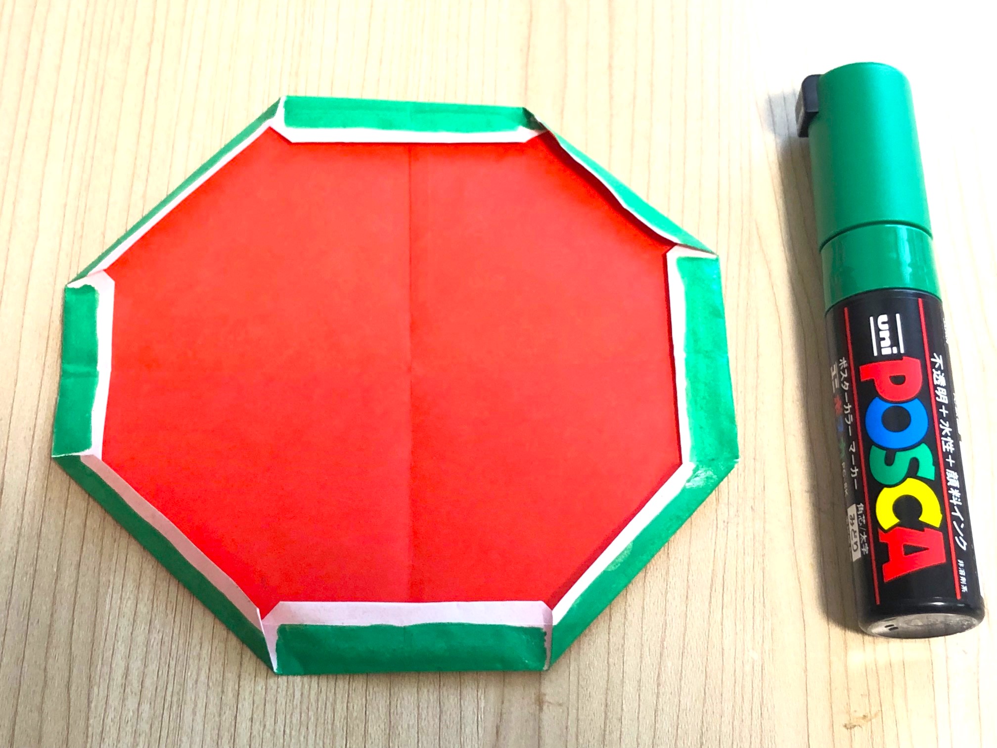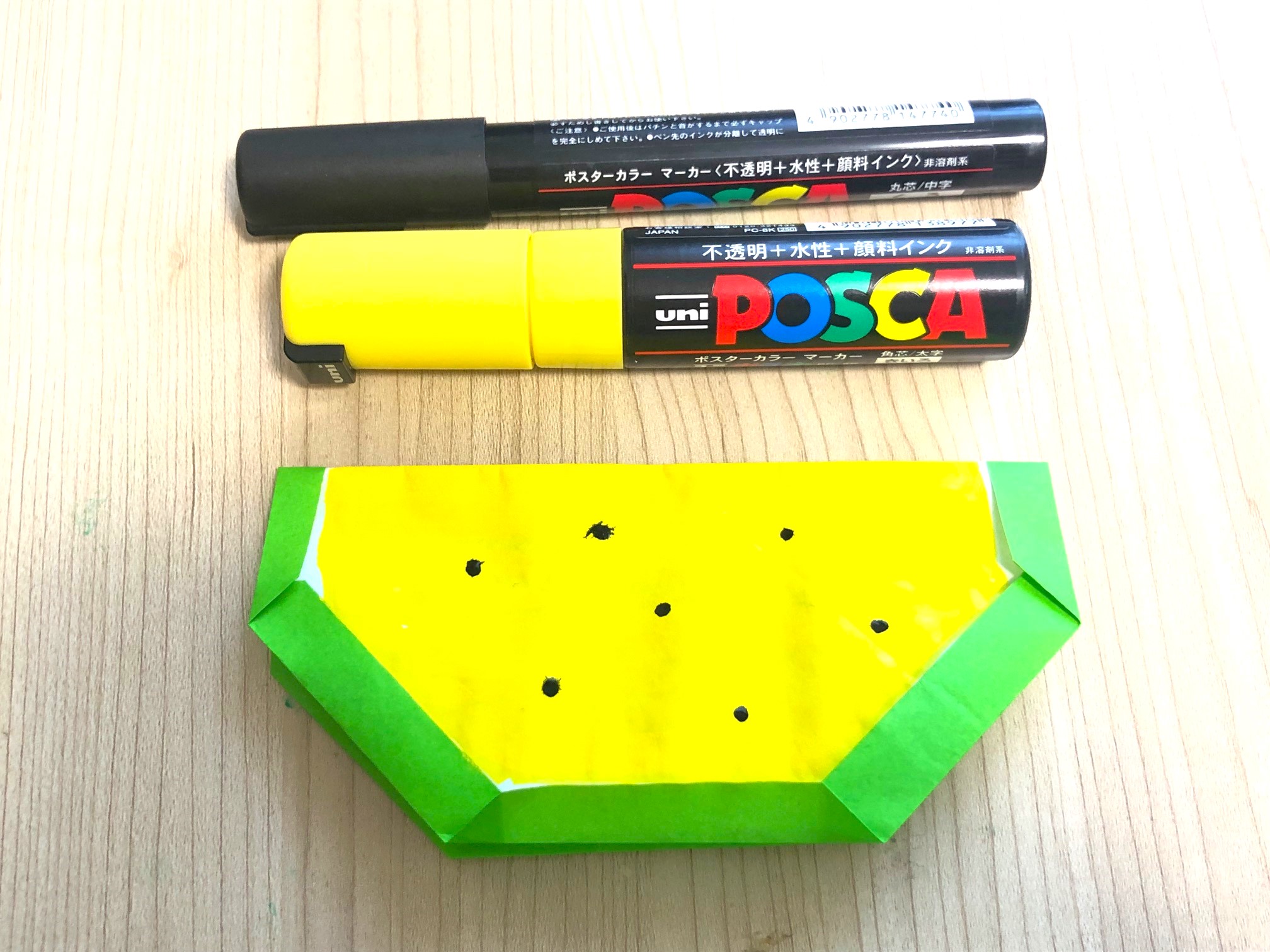 このスイカ色を変えたいな~っと思ったときには、折り紙の裏と表を逆にして、色を塗るだけで簡単に出来ます♪